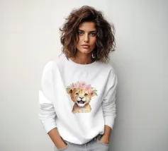 Portrait of a lion shows large, expressive eyes and a colourful wreath of flowers. The soft fur is perfectly accentuated in a minimalist photographic illustration and captures the extraordinary charm of nature. Ideal for animal lovers.