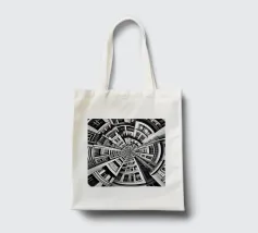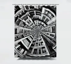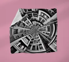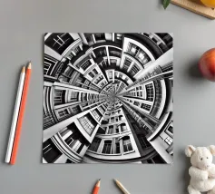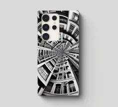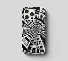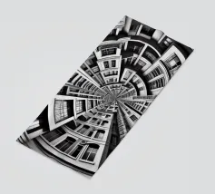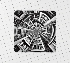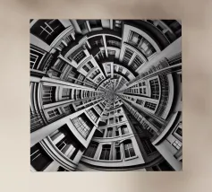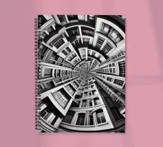 A striking black and white fisheye depiction of symmetrical urban architecture with layered windows, curved facades, and intricate details. The spiral-like composition creates depth, harmony, and a surreal, futuristic aesthetic.