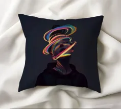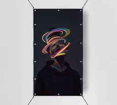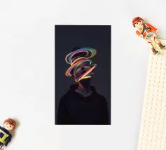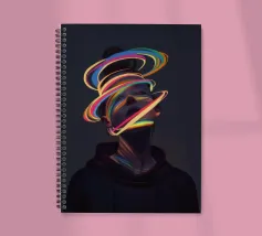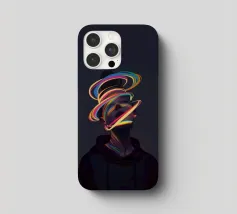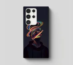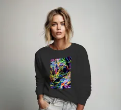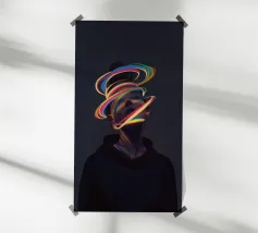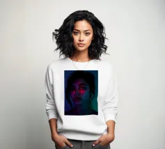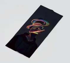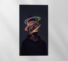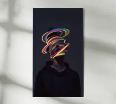 A surreal digital artwork features a woman in a dark hoodie, her face illuminated by vibrant neon light trails. The glowing, multicolored swirls wrap around her head and neck, creating a futuristic and dreamlike atmosphere.