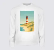 Minimalist and decorative summer travel design with a beautiful sea beach and the List-Ost lighthouse on Sylt. Typical red and white lighthouse as found on the coasts of the North Sea and Baltic Sea. Summer holiday design for everyone who loves to go on holiday to Sylt or the German North Sea coast.