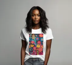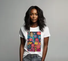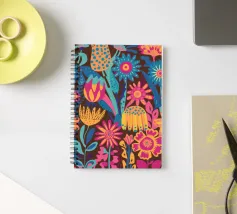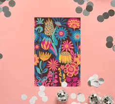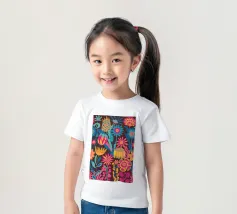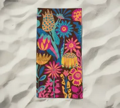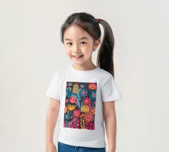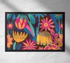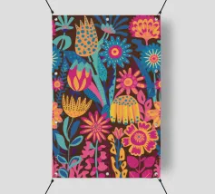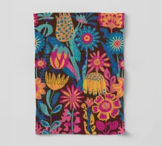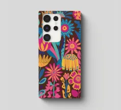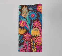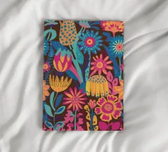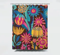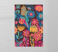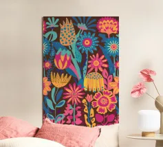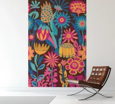 A dense, maximalist pattern completely filled with a variety of colorful, stylized flowers in pinks, oranges, and blues, creating a carpet of blooms.