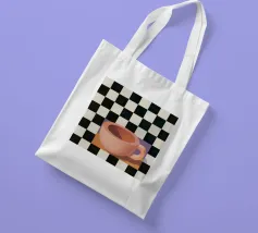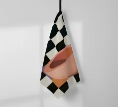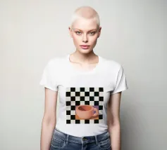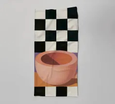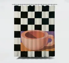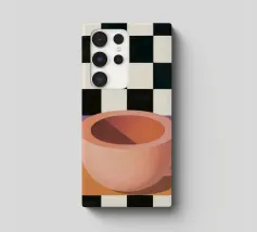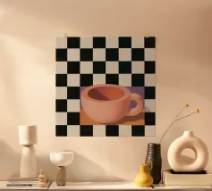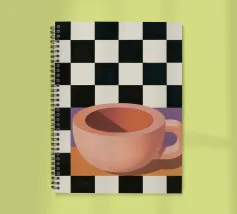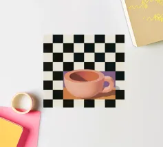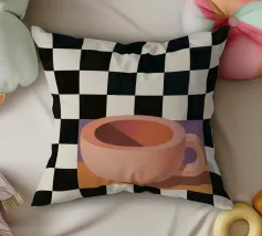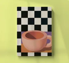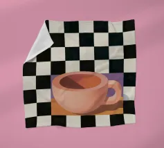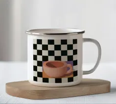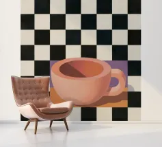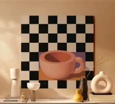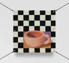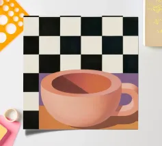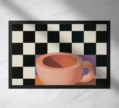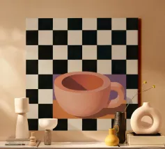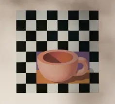 A simple still life of a pink coffee cup on a black and white checkered surface, against a neutral background, highlighting form and pattern.