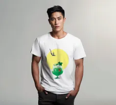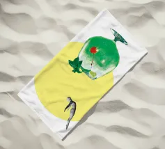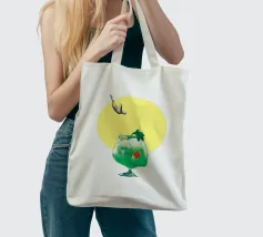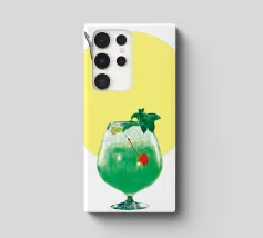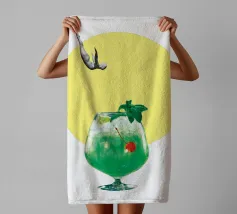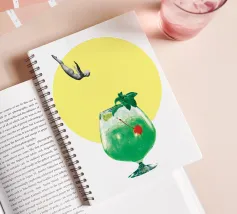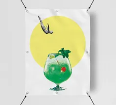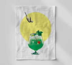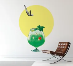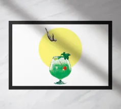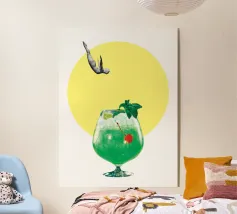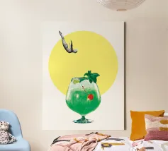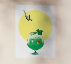 Thank God it's Friday surreal collage art by MsGonzalez. Minimalist black & white image of a vintage swimmer diving head first into a green cocktail with mint and a cherry. Big yellow sun circle in the background. Retro holiday vibes.