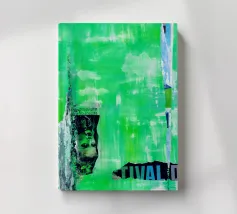Collage of acrylic paint, textured paste, poster elements and magazine