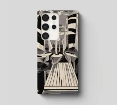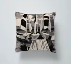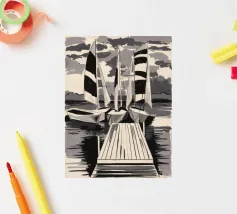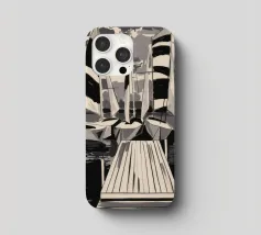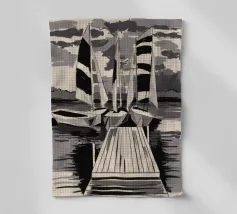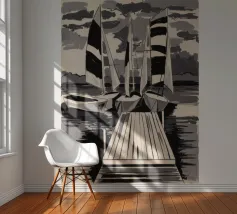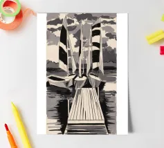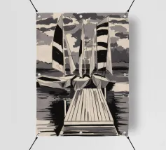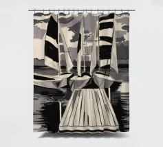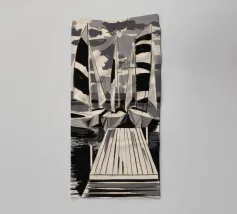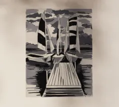 Striped sailboats docked at a pier in high contrast black and white, evoking bold graphic strength.