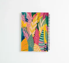 A dense, colorful pattern of overlapping tropical leaves and abstract shapes in bright hues of yellow, pink, blue, and green, creating a joyful, energetic design.
