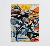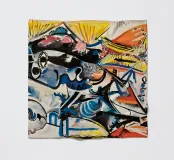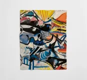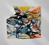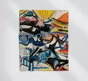 This vibrant and energetic abstract expressionist painting features a dynamic interplay of forms, colors, and textures, creating a sense of controlled chaos. Bold brushstrokes in blue, black, white, and orange dominate the canvas, with hints of yellow and green in the background. Recognizable elements, such as what appears to be a butterfly and fragmented facial features, emerge from the abstract composition, inviting multiple interpretations. This high-quality digital poster (7000x5000 pixels, 300 dpi) perfectly captures the raw emotion and spontaneous energy of abstract expressionism, making