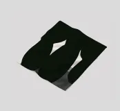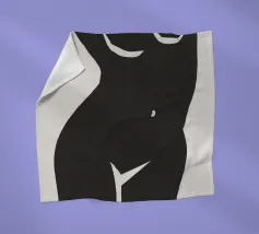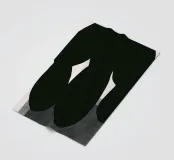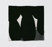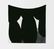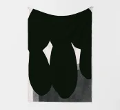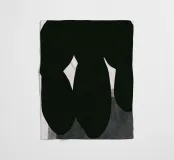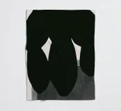 Bold black abstract shapes overlap against a light background, creating a dynamic and intriguing composition. The contrast between the dark forms and the muted backdrop draws attention to the interplay of shapes and negative space.