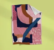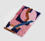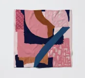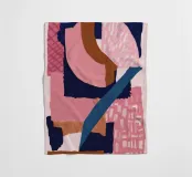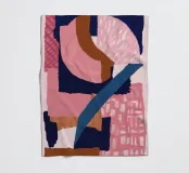 A bold and modern abstract composition features a dynamic arrangement of overlapping shapes in pink, navy blue, and black, with textured details creating a sophisticated and graphic piece.