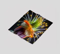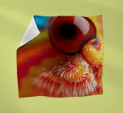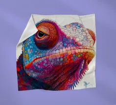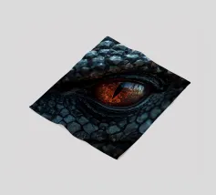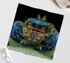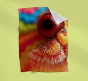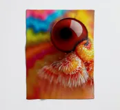 A striking close-up reveals a vibrant creature adorned with colorful patterns and intricate details. The design features a prominent eye and delicate textures