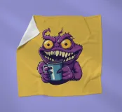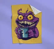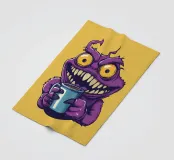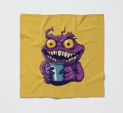 A whimsical purple monster with sharp teeth, bright yellow eyes, and a mischievous grin clutching a blue coffee mug. The playful cartoon style adds a fun, quirky vibe perfect for humorous or caffeine-themed projects.