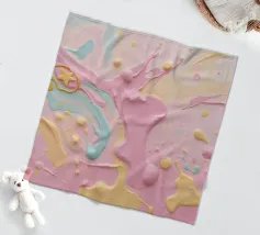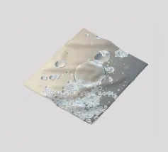 A fluid splash of creamy substance creates dynamic shapes on a warm background. Bubbles rise amidst soft colors, capturing a sense of movement and energy in the design.