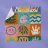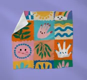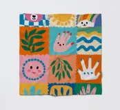 A colorful patchwork quilt design featuring cute characters like a sun, a rainbow, a lion, a bunny, and abstract hands on checkered backgrounds.