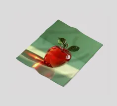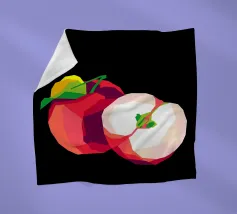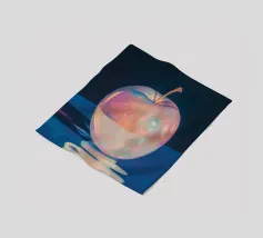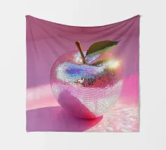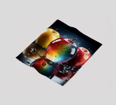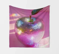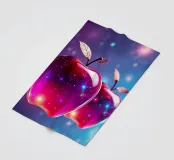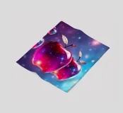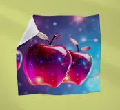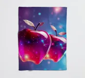 Glossy apples with a vibrant cosmic design float against a colorful background filled with sparkling lights.
