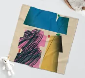 Bold geometric shapes in blue, yellow, and pink contrast against a neutral background. Organic shadows and colorful dots provide a dynamic and abstract composition.