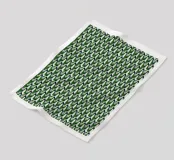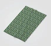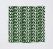 The image features a complex, repeating geometric pattern with interlocking shapes. A blend of green, black, and white dominates the composition, creating a visually dynamic effect.