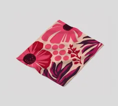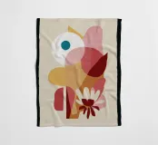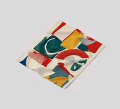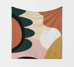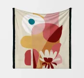 A sophisticated abstract piece with layered, semi transparent shapes in a warm palette of red, pink, and ochre, creating depth and a sense of gentle movement.