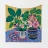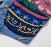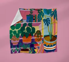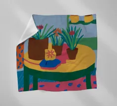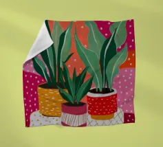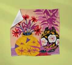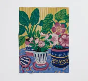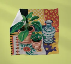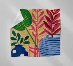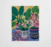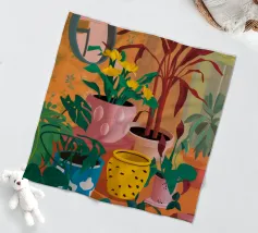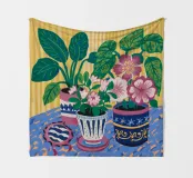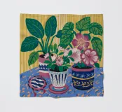 Several potted plants with vibrant flowers and leaves, in uniquely patterned pots, arranged on a surface with a patterned cloth, creating a rich textural and colorful display.
