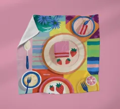 A delicious stack of golden brown pancakes, topped with a melting pat of butter and drizzled with syrup, is the star of this artwork. Presented with colorful mugs, the illustration is a mouth watering celebration of a classic, beloved breakfast treat.