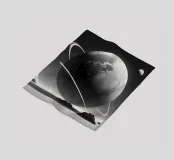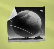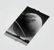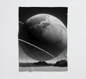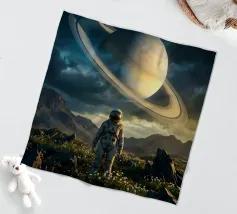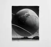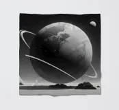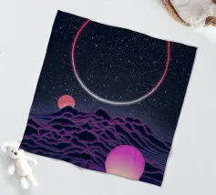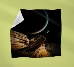 A large planet adorned with rings floats above a barren terrain, while distant celestial bodies illuminate the starry sky. Shadows of mountains add depth to the surreal setting.