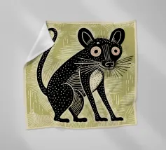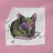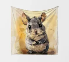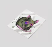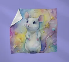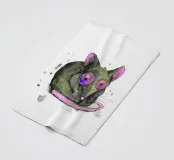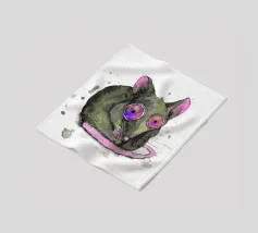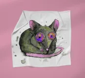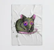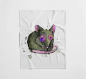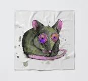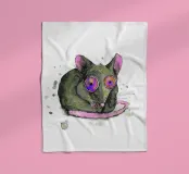 A spotty watercolor drawing of a black rat. Grunge dripping style. He has big purple eyes. He looks at you in bewilderment.