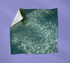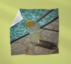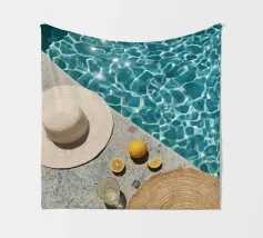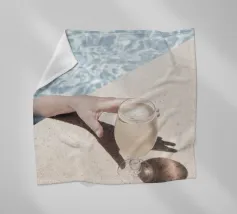 The photograph captures a serene moment on a sun-drenched rooftop in Marrakech, where the vibrant blue sky meets the tranquil waters of a polished, neutral beige-colored pool. A glass of crystal-clear water stands gracefully beside the pool’s edge, catching the sunlight, which reflects off the smooth surface of the water. The surrounding pool bath , with its warm, neutral tones, enhance the calm, minimalist elegance of the scene.