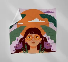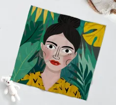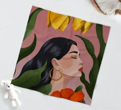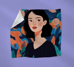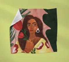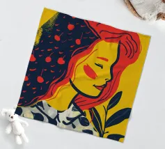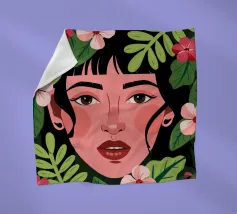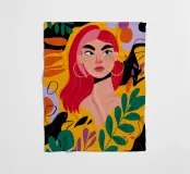 A portrait of a woman with flowing red hair, surrounded by stylized leaves and flowers, looking thoughtfully to the side. The style is modern, bold, and slightly art nouveau.