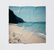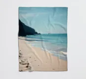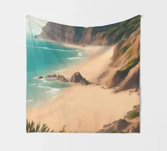 A tranquil beach stretches along the coast, with gentle waves rolling in under a clear blue sky. The soft sand is untouched, inviting visitors to relax and enjoy nature.