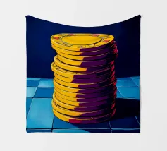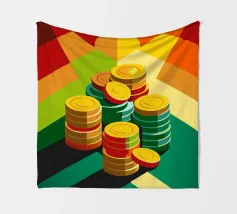 Piles of shiny coins are arranged in varying heights, surrounded by scattered coins, all illuminated against a black background, creating an eye-catching contrast.