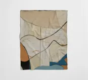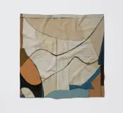 This painting features an abstract composition with flowing lines and shapes, using a muted color palette of beige, brown, and blue. The artwork is subtle and elegant, creating a sense of harmony and balance.