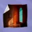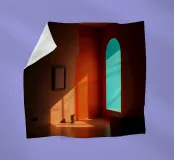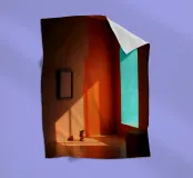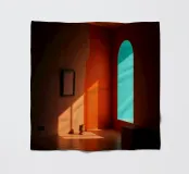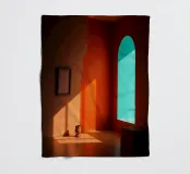 Soft sunlight filters through a turquoise window, casting shadows on orange walls. A clay pot sits on the wooden floor, enhancing the artistic ambiance of the space.