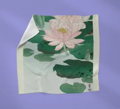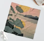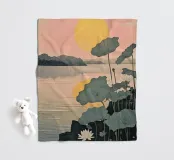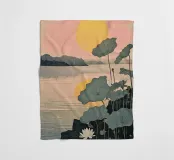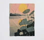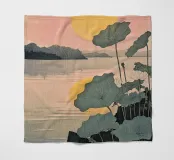 A woodcut with lotus leaves and water lilies on the shore, with a setting sun in a pale pink sky over a calm lake. An island can be seen on the horizon in the background, surrounded by trees and distant mountains. This artwork embodies the aesthetics of the Edo period and shows the simplicity of the woodcut techniques and the calm colours.