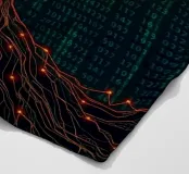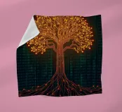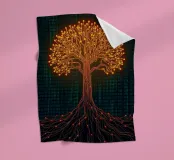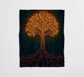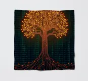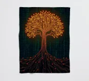 An entrancing, neon-lit depiction of a tree where every branch and leaf is a glowing circuit board. Its intricate, sprawling roots connect to a dark, stylized soil, while the background is filled with streams of cascading green binary code, blending nature with technology. This piece masterfully symbolizes the intertwined relationship between organic life and the digital world, perfect for anyone who appreciates the aesthetics of technology, cyberpunk, or abstract art.