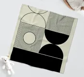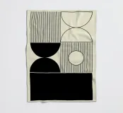 his minimalist piece, 'The Pause,' is a masterclass in visual balance and modern aesthetic. It uses bold black and soft cream to explore positive/negative space. A solid black base anchors the work, while dynamic curves contrast sharply with precise vertical striping above. This simple arrangement creates striking graphic impact and clarity. Its clean lines give it a timeless, retro-modern feel, perfect for contemporary or Scandinavian interiors. A powerful decor statement.