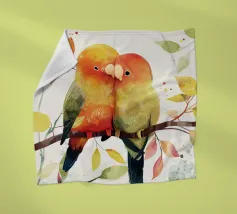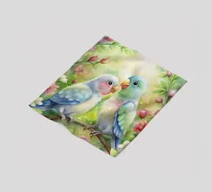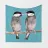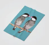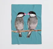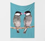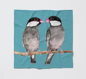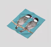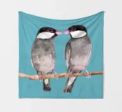 A watercolor drawing of two Java sparrows. They sit next to each other on a long stick and touch each other with the tips of their beaks.