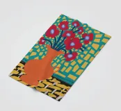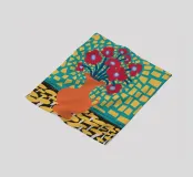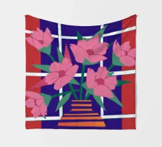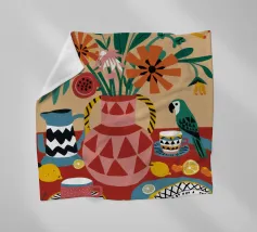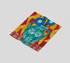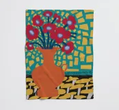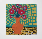 A joyful still life of a bouquet of red poppies in a terracotta vase, set against a cheerful, patchwork like background of yellow and blue tiles.
