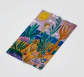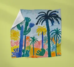 A vibrant, abstract landscape featuring a bright sun, palm trees, and stylized flowers. The bold colors and modern, graphic style create an energetic and joyful celebration of a tropical paradise.