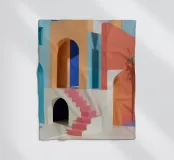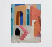 A surreal architectural composition of arches, stairs, and doorways in a soft pastel palette of pink, blue, and beige. A lone palm tree adds a touch of nature to this tranquil and dream like labyrinth.