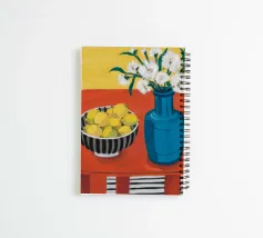 An inviting still life on a bright red table, featuring a bowl of lemons and a blue vase holding delicate white flowers. The warm yellow background enhances the cozy and vibrant atmosphere.