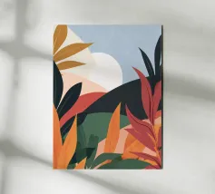 A modern abstract composition of various stylized botanical shapes and leaves in a palette of terracotta, beige, and dark blue against a light background.