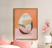 A contemporary Easter egg illustration built from layered abstract shapes in soft terracotta, blush, sand and sage tones. The minimalist composition and warm spring palette create a calm modern aesthetic inspired by contemporary abstract painting. This artwork brings a subtle seasonal mood and gentle color harmony, making it perfect for spring decor and modern interiors.