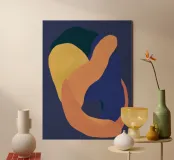 An abstract composition of overlapping, rounded shapes in yellow, orange, and deep blue, suggesting a reclining human form in a minimalist and fluid style, exploring the essence of shape and color.