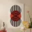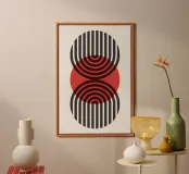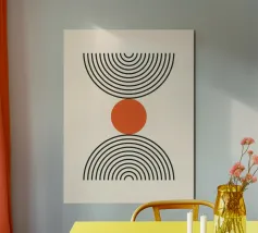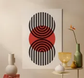 A bold Bauhaus-inspired abstract design featuring layered red circles and rhythmic black vertical lines. A striking modern statement piece perfect for contemporary interiors.