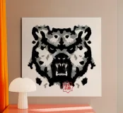 A bear face depicted in black and white with watercolor-like stains that evoke the aesthetic of a Rorschach test. This work of art expertly engages our interpretive skills, making it an ideal choice for bear lovers who enjoy the fun of perception