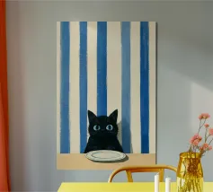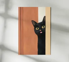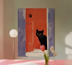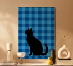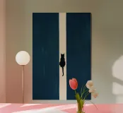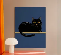 This minimalist composition explores solitude and direction through stark geometry and restrained symbolism. A solitary black cat is reduced to a near-silhouette, centered precisely along a vertical band of light that divides a deep, textured field of blue. The contrast between darkness and illumination becomes the primary narrative device, evoking themes of choice, transition, and quiet determination.