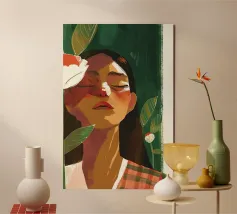 A vibrant and modern illustration of a woman with her eyes closed, wrapped in a colorful, nature-inspired coat. The bold textures and botanical patterns symbolize inner strength, empowerment, and self-expression. This artwork radiates warmth and confidence, making it the perfect piece for contemporary interiors, creative studios, or any space celebrating feminine energy and individuality.