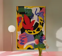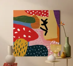 A vibrant and eclectic abstract collage featuring a mix of bold patterns, including stripes, cheetah print, and polka dots. The composition is a playful and energetic expression of a modern bohemian or maximalist style.