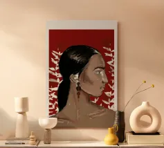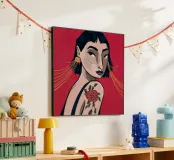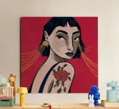 This painting depicts a person with a tattoo of a rose on their shoulder. The person is wearing large, golden earrings, and the background is a striking red, emphasizing the bold and expressive nature of the artwork.