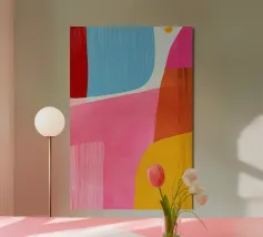 A bold and modern abstract composition features a dynamic arrangement of overlapping shapes in pink, navy blue, and black, with textured details creating a sophisticated and graphic piece.