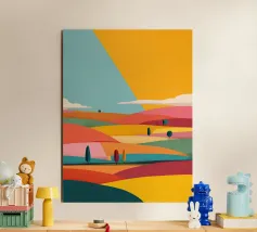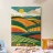 A vibrant landscape of bountiful, rolling fields of crops under a sunny sky with fluffy clouds. The stylized, colorful depiction of the countryside celebrates the beauty and abundance of agricultural land.